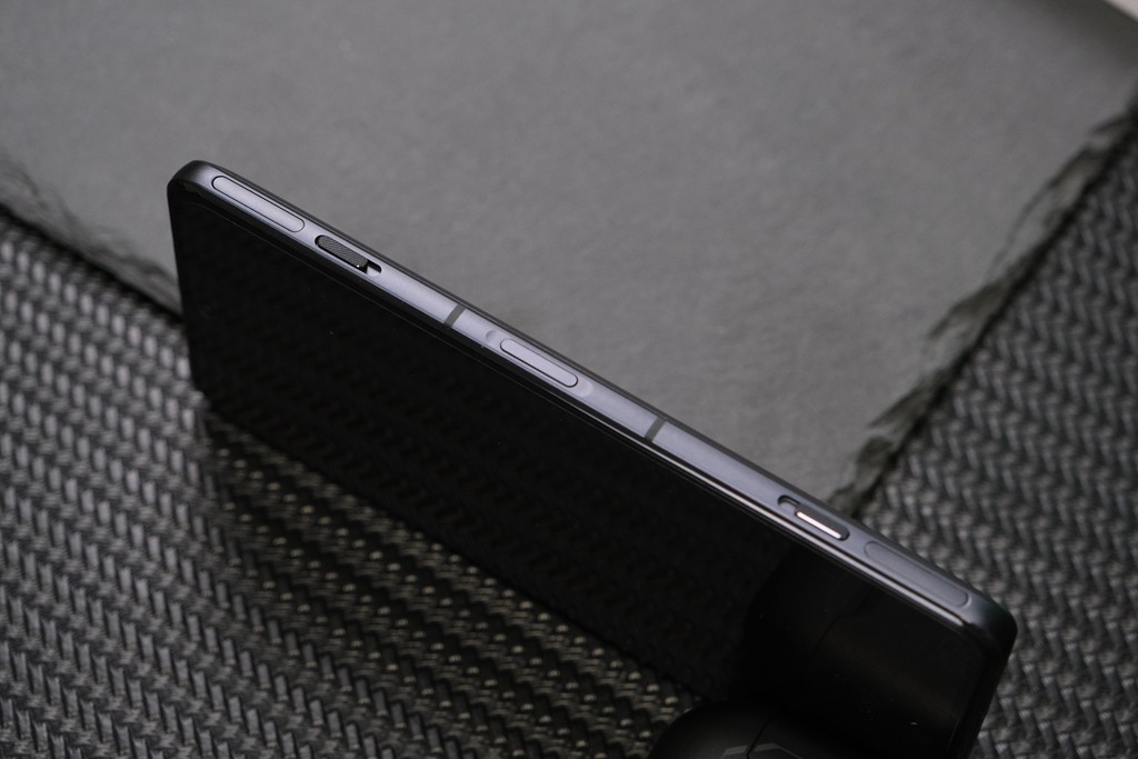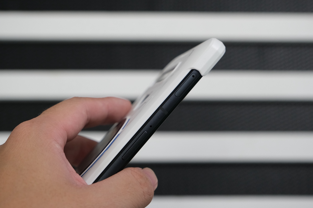 当然了,该机本身定位就是偏向游戏体验,所以在机身中“塞入”了三明治散热系统2.0、实体升降按键等配置,就注定了它是一款主打实用性,而非走时尚气息的一款机型了。当然了,我个人觉得9.9毫米以及210克的重量刚刚好,放在口袋里不重不轻,还是蛮有质感的。