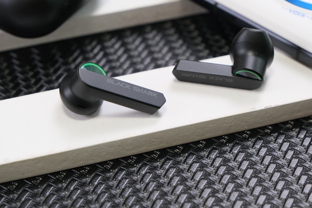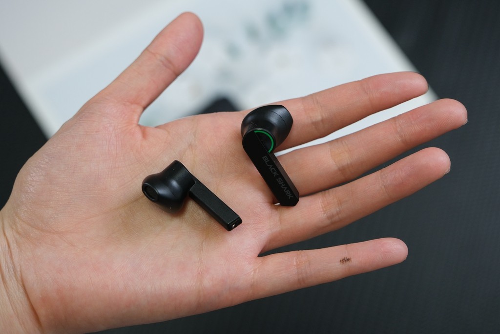 黑鲨凤鸣真无线蓝牙耳机在形态上更有几何设计感,并非圆柱形的耳柄,而选为长条形切割的耳柄设计,而且耳腔设计加入了一圈绿色光圈的融入,真的很有电竞风,特别上镜。