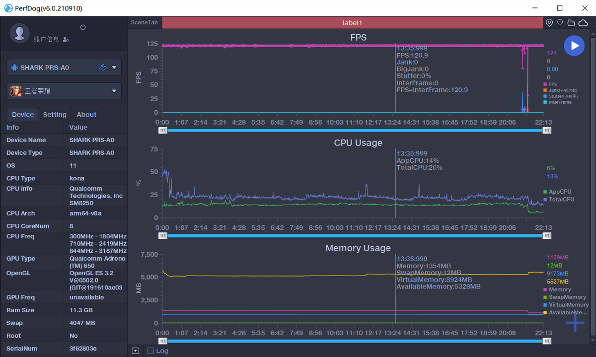 使用黑鲨4S运行《王者荣耀》(120帧极致模式),跑了121fps,这个成绩也是非常亮眼的了,基本全程满帧运行,而且CPU利用率也只有20%左右,后台同时运行多款游戏都可以完美胜任。